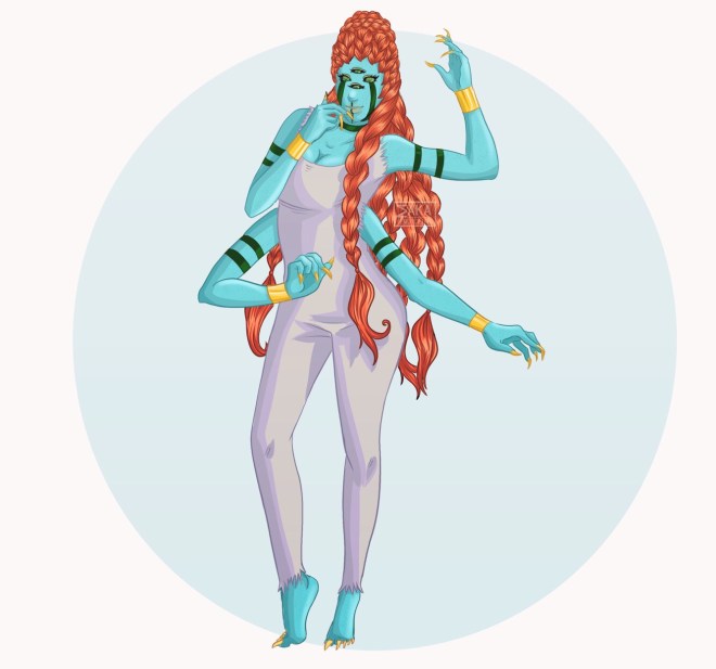 - four arms, long and bright yellow fingernails, bright yellow toenails