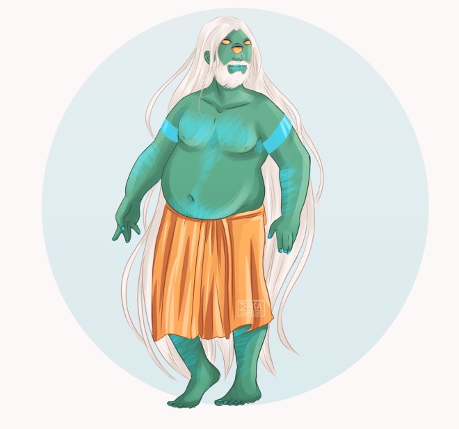 - emerald green skin tone, very heavyset with stomach overlapping waist